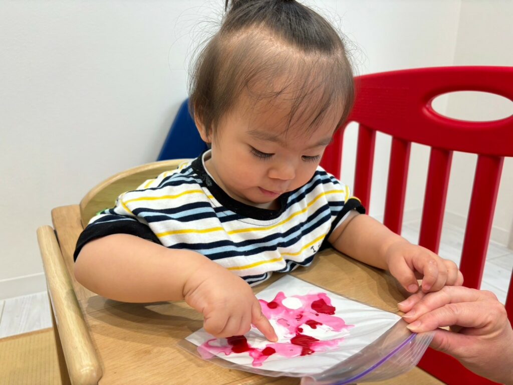 ジップロックから伝わる絵の具の感触に始めは不思議そうなお顔でしたが、